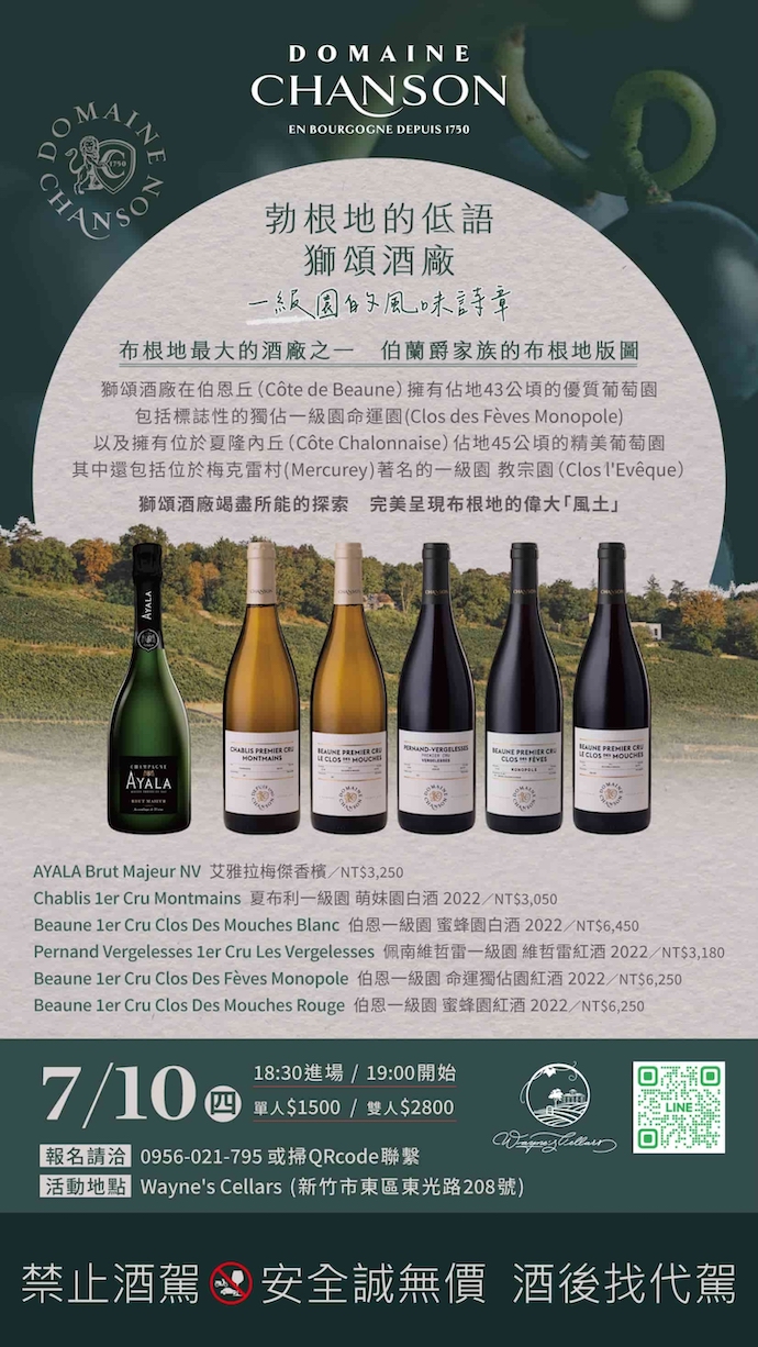 Wayne’s Cellars 誠摯邀請您參加「獅頌酒廠 Domaine Chanson 品酒會」,一同品味法國百年名莊的風華。